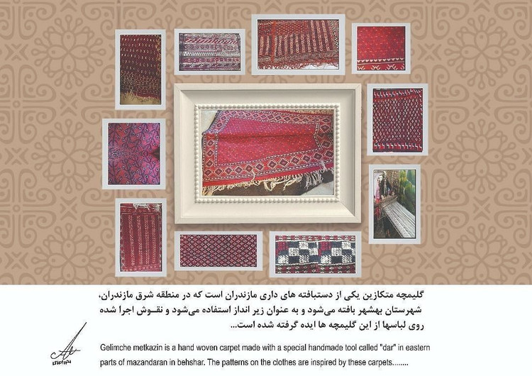 گلیمچه متکازین یکی از دستبافته های داری مازندران است که در منطقه شرق مازندران، شهرستان بهشهر، با دستگاههای بافندگی به نام کرت چال بافته میشود و به عنوان زیر انداز استفاده میشود و نقوش اجرا شده روی لباسها از این گلیمچه ها الهام گرفته شده است....